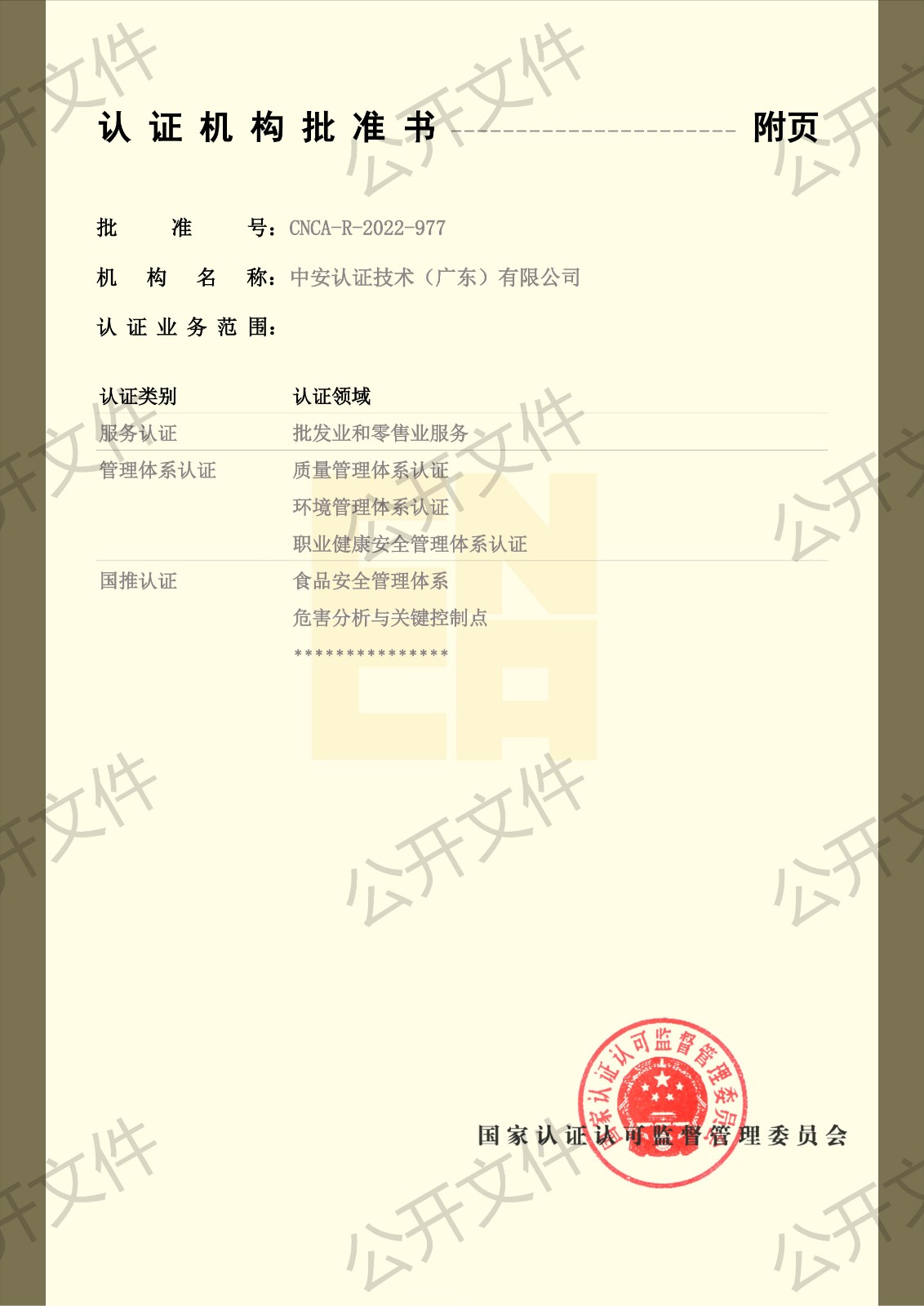 中安认证机构批准证书